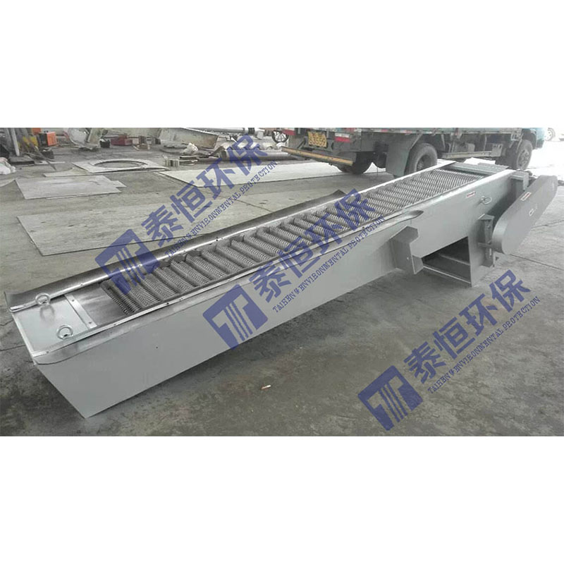 回轉(zhuǎn)式格柵除污機(jī)設(shè)備是由一種獨(dú)特的耙齒廠裝配成一組回轉(zhuǎn)格柵鏈。在電機(jī)減速器的驅(qū)動(dòng)下,耙齒鏈進(jìn)行逆水流方向回轉(zhuǎn)運(yùn)動(dòng)。耙齒鏈運(yùn)轉(zhuǎn)到設(shè)備的上部時(shí),由于槽輪和彎軌的導(dǎo)向,使每組耙齒之間產(chǎn)生相對(duì)自清運(yùn)動(dòng),絕大部分固體物質(zhì)靠重力落下。另一部分則依靠清掃器的反向運(yùn)動(dòng)把粘在耙齒上的雜物清掃干凈。按水流方向耙齒鏈類同于格柵,在耙齒鏈軸上裝配的耙齒間隙可以根據(jù)使用條件進(jìn)行選擇。當(dāng)耙齒把流體中的固態(tài)懸浮物分離后可以保持水流暢通流過(guò)。整個(gè)工作過(guò)程是連續(xù)的,也可以是間歇的。